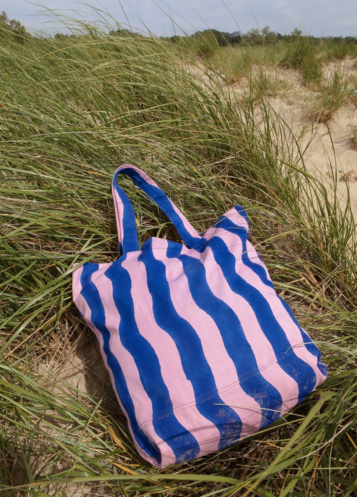 The oversized, multi-use Wave Tote is stylish enough to compliment any outfit and sturdy enough to carry your laptop, farmer's market finds, or beachside essentials. Crafted from 100% cotton canvas and hand block printed in bright pink and ocean blue by artisans in India, every tote is unique.
